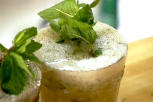 Coloque gelo em um copo e passe a mistura para este copo.Junte o xarope de açúcar, rum e complete com o suco de abacaxi.Agite bem a mistura, como numa coquteleira, e coloque em copos com gelo, completando com água gaseificada.Enfeite o drinque com um raminho de hortelã e um pedaço de limão.