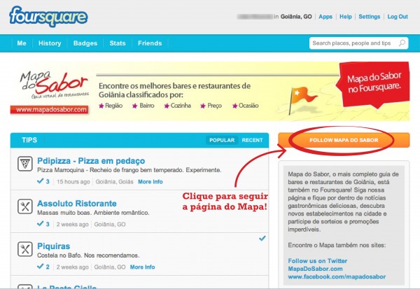 O procedimento é bem simples: acesse www.foursquare.com/mapadosabor, clique no botão “follow†(procedimento igual ao do Twitter) e pronto!
