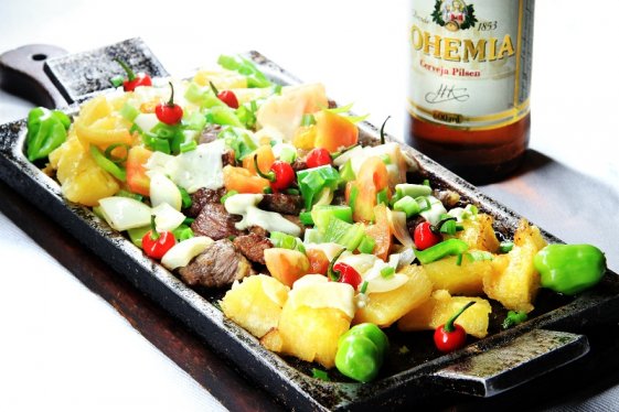 Filé a moda . Filé mignon com tomate, cebola e mandioca cobertos com queijo, servidos na chapa.