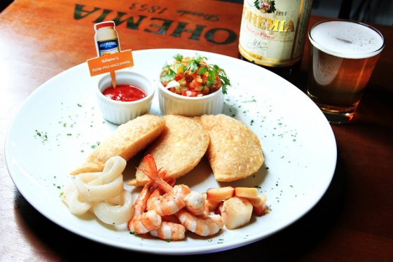 Pastel de Frutos do Mar . Porção de pastéis recheados com frutos do mar ao azeite e leite de coco. Acompanha vinagrete e molho especial da casa a base de Hellmann´s.