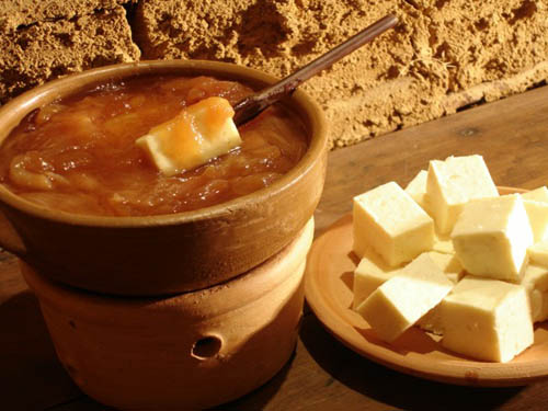 Coloque os cajus, a água e o açúcar em uma panela tampada e leve ao fogo baixo até que as frutas fiquem bem cozidas. Processe o doce de caju, misture o creme de leite e leve a uma panela para esquentar. Sirva ainda quente mergulhando os cubos de queijo no doce.
