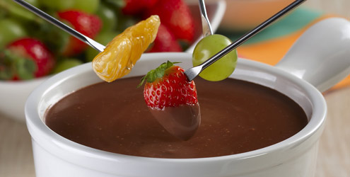 Em uma panela, dissolva o pó para pudim no leite. Leve ao fogo e mexa sem parar até engrossar. Desligue o fogo, junte o chocolate e mexa sem parar até derreter completamente. Misture o creme de leite e transfira para uma panela de fondue. Sirva com as frutas da sua preferência