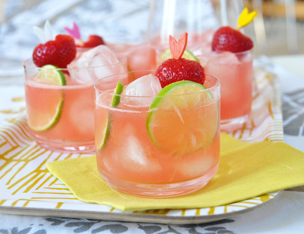 Bata num liquidificador a vodka, o licor de morango, a melancia, o suco de limão e o gelo até virar um frozen. Sirva em copos com gelo e adicione as fatias de limão e os morangos para decorar.