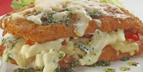 Montagem: Sobre três filés de frango, distribua o recheio: intercale os queijos e os tomates. Sobre cada um, coloque outro filé e prenda com palitos. Disponha-os em uma assadeira, polvilhe o queijo ralado e leve ao forno preaquecido a 200º até derreter totalmente os queijos. Sirva em seguida com o pesto de coentro.